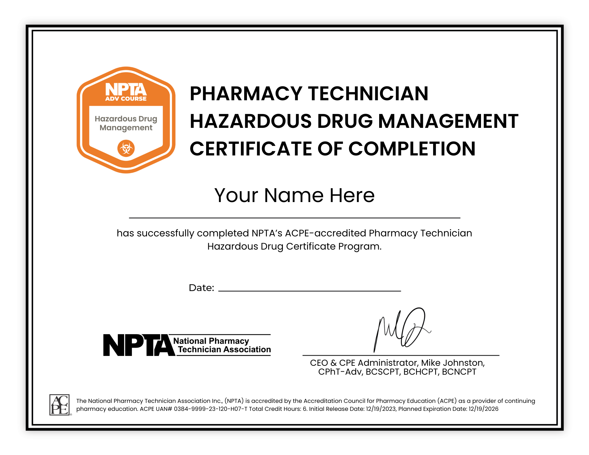 This course is ACPE-accredited for 6 hours of continuing pharmacy education. This course is also recognized by the Board of Pharmacy Technician Specialties (BPTS) for the Hazardous Drug Management exam.